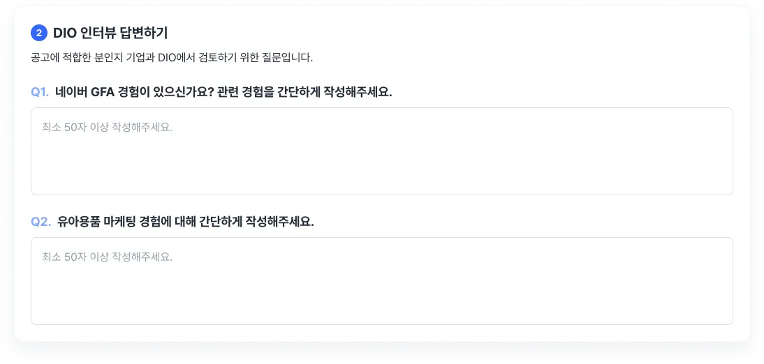 DIO의 고객들의 경우 마케터가 가장 최근 많이 겪고, 능숙한 도메인/상품을 원하기 때문에 콕 찝어서 ‘가장 능숙한 도메인/상품’을 말씀해주시지 않으면 기업이 거절하는 확률이 높아집니다.