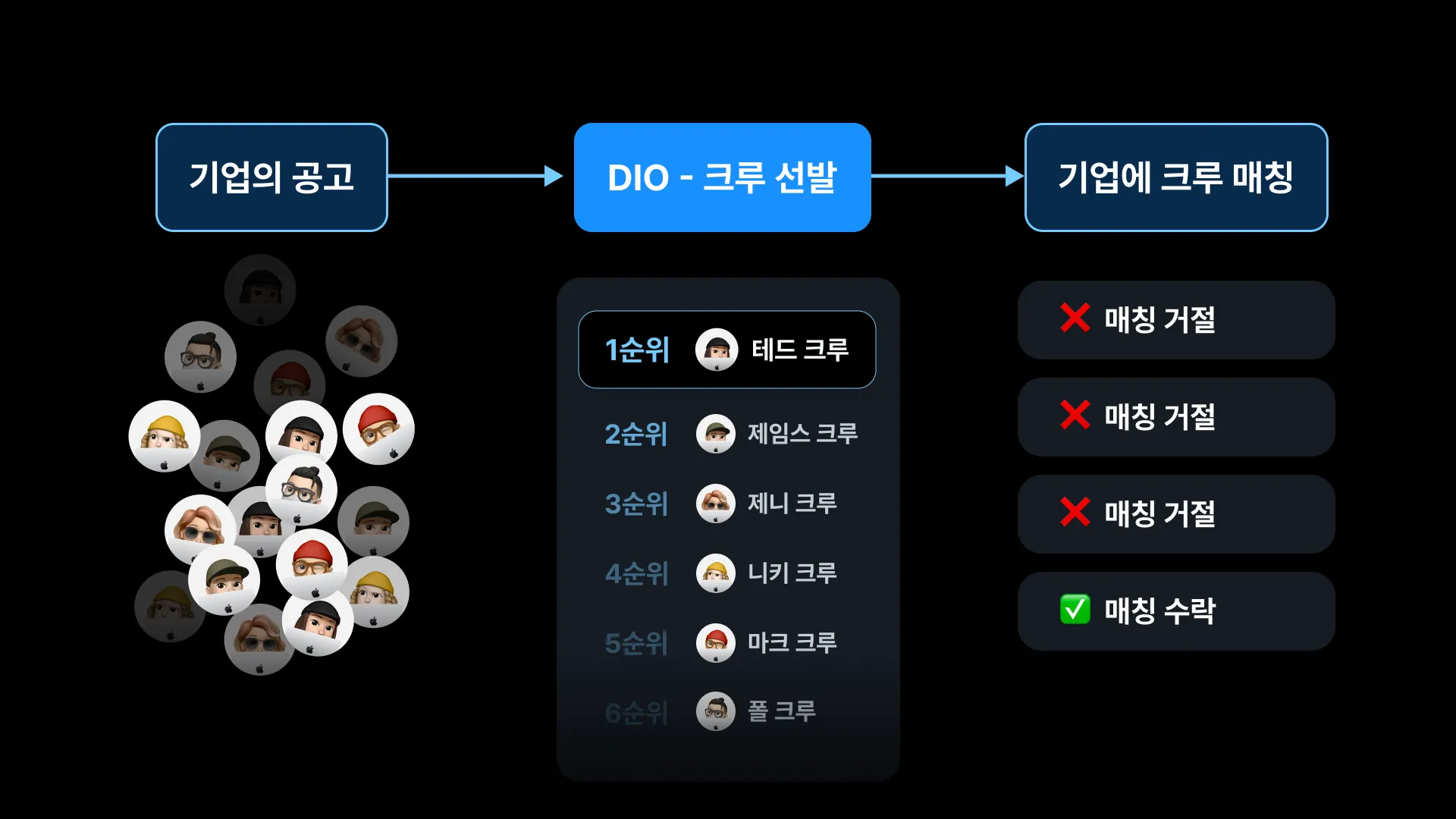 기업의 공고가 등록되면, DIO는 기업의 공고에 적합한 크루를 찾습니다.