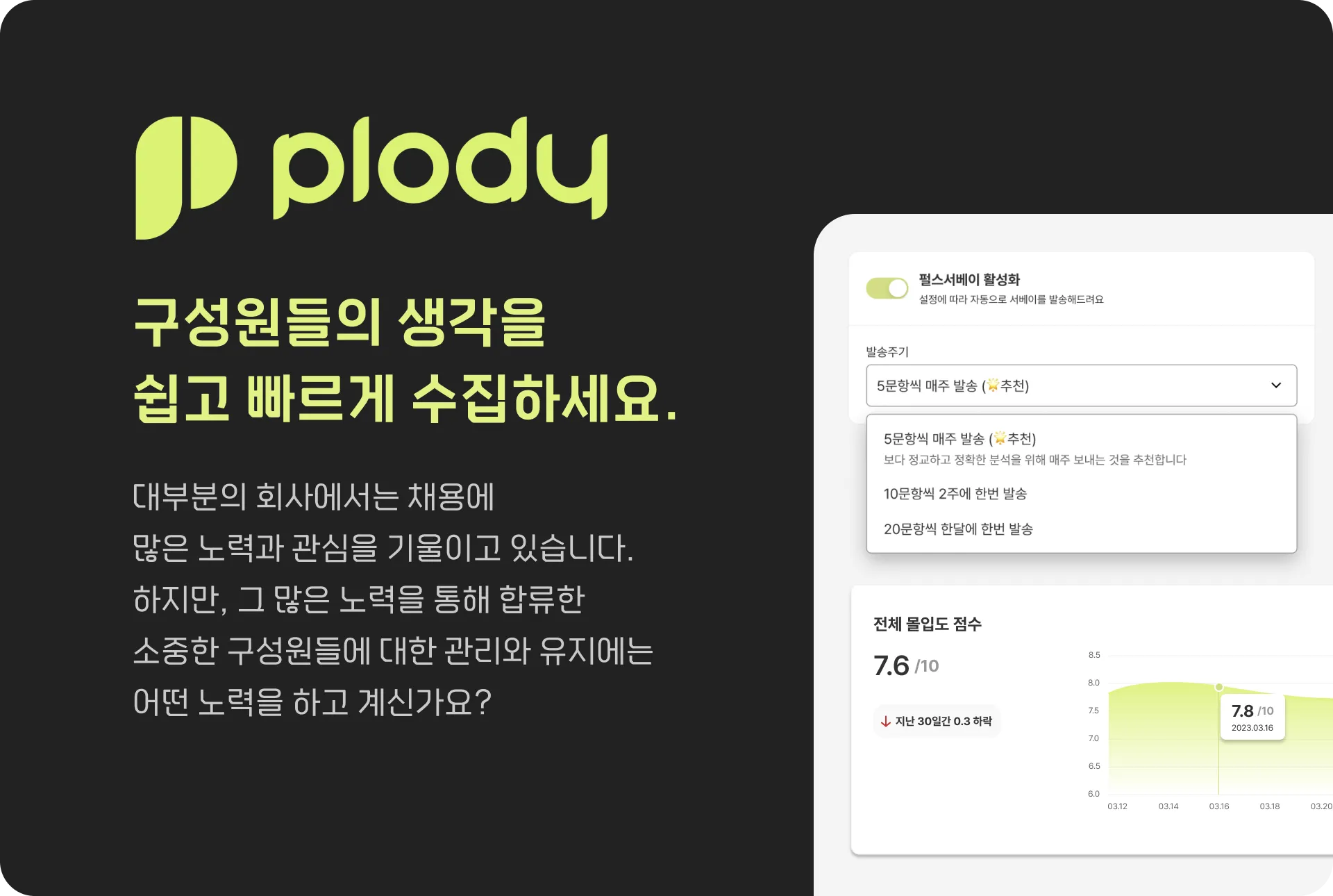 안녕하세요, HR 특화 서베이 (설문조사) 서비스 플로디 (Plody)를 만들고 운영하는 딥사이드 공동대표 이승태입니다. 플로디는 기업 구성원들의 의견을 쉽고 효율적으로 모으기 위해 HR 전문가들이 만든 서베이 템플릿, 제작부터 발송까지 자동화된 프로세스, 서베이 결과를 한 눈에 볼 수 있는 데이터 대시보드 등을 제공하고 있어요.