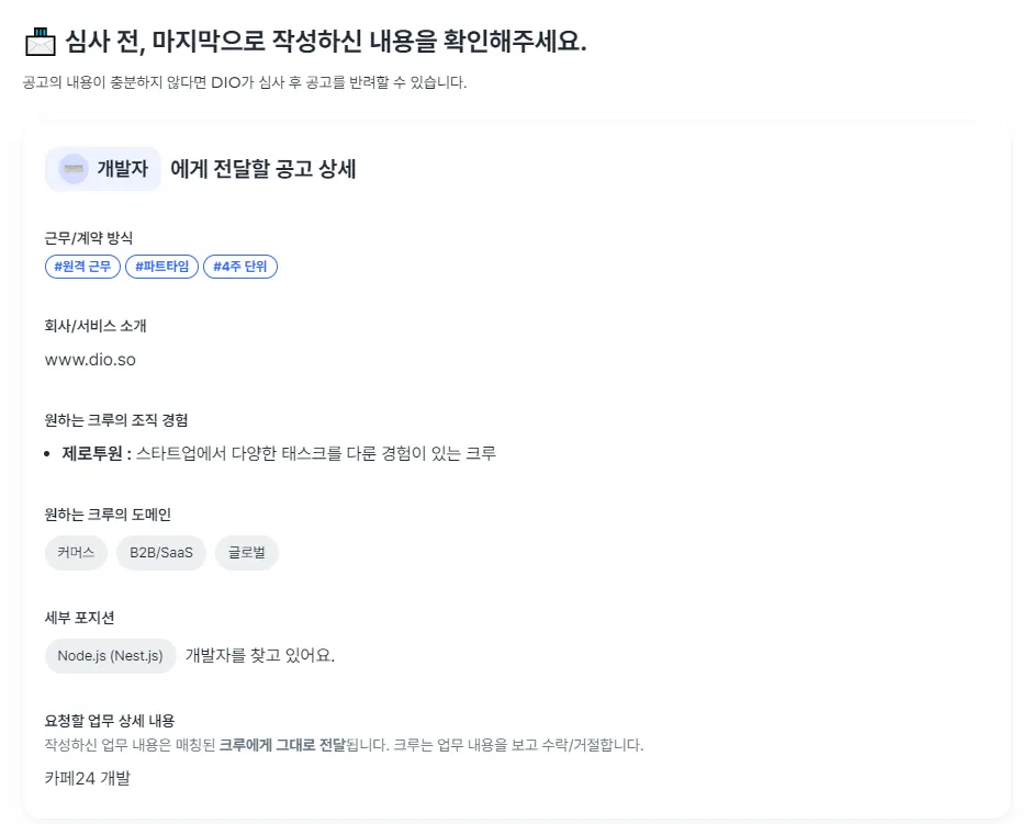 먼저 원하는 인재 정보를 입력하는 과정이 편리하고 상세해 좋았어요. 경험부터 산업 분야, 세부 직무, 꼭 알아야 할 사항 등을 작성하면서 저희가 원하는 인재상도 좀 더 깊게 생각할 수 있었어요. 그리고 입력만 하면 DIO에서 해당 채용 조건에 맞는 인재를 빠르게 연결해 줘요.