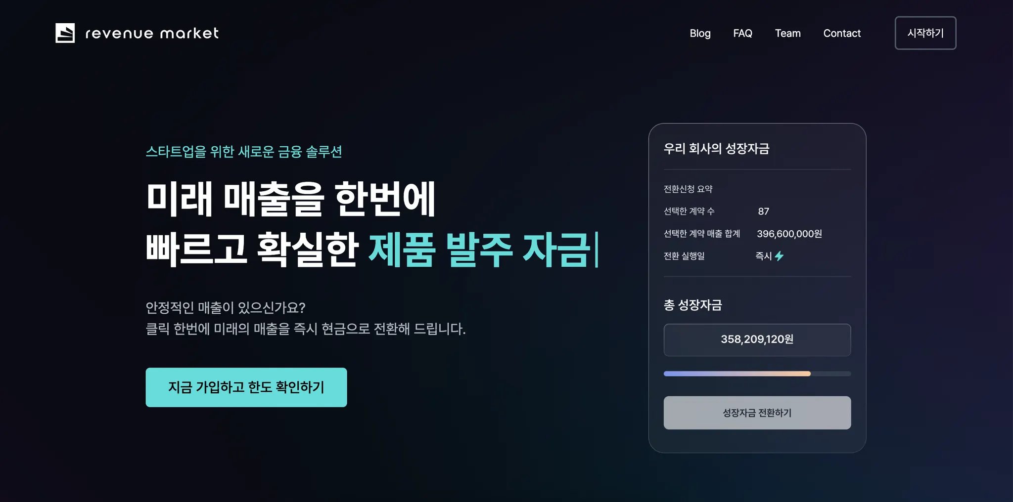 이처럼 레베뉴마켓은 작은 스타트업이 빠르게 자금을 조달할 수 있는 서비스를 제공해 주고 있다고 보시면 돼요.